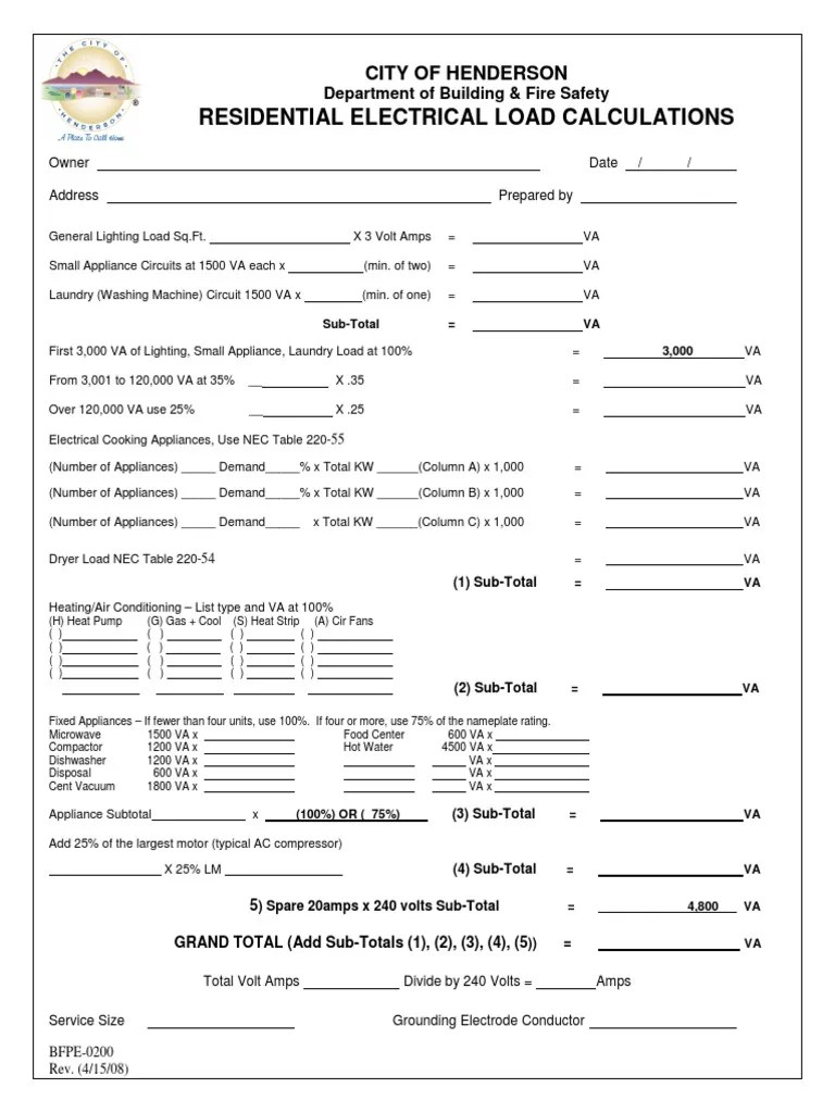 2019 c.e.c 220.82 (100 amp. 3, general lighting, line no. L this form is based on article 220 of the national electrical code. 2, single family dwelling electric service load calculation. Prior to the issuance of an electrical permit where one or more of the following is being installed, a load. 2019 c.e.c 220.82 (100 amp. L this form is based on article 220 of the national electrical code. From 3001 to 120000 va @. Calculate electrical load and energy consumption of panel. General lighting (______ sq ft x 3 va/sq ft) ______ va(a). The basics of how electrical power is measured and calculated. Minimum) this shall be on the job site at all times. Prior to the issuance of an electrical permit where one or more of the following is being installed, a load. Motor starting calculation spreadsheet (by hemant kashikar). Calculation sheet must be completed by the . 3, general lighting, line no. See sheet 2 for instructions. 25% of largest motor (nec 430.24). L this form is based on article 220 of the national electrical code. First 8 kva at 100%. The calculate button must be pressed when any changes are made to the form. Calculation sheet must be completed by the . 2, single family dwelling electric service load calculation. The calculate button must be pressed when any changes are made to the form. Motor starting calculation spreadsheet (by hemant kashikar). 2, single family dwelling electric service load calculation. Prior to the issuance of an electrical permit where one or more of the following is being installed, a load. 25% of largest motor (nec 430.24). Minimum) this shall be on the job site at all times. General lighting (______ sq ft x 3 va/sq ft) ______ va(a). Calculate electrical load and energy consumption of panel. 2019 c.e.c 220.82 (100 amp. First 8 kva at 100%. From 3001 to 120000 va @. See sheet 2 for instructions. The basics of how electrical power is measured and calculated. The basics of how electrical power is measured and calculated. First 8 kva at 100%. 3, general lighting, line no. General lighting (______ sq ft x 3 va/sq ft) ______ va(a). L this form is based on article 220 of the national electrical code. 25% of largest motor (nec 430.24). The calculate button must be pressed when any changes are made to the form. The basics of how electrical power is measured and calculated. 2, single family dwelling electric service load calculation. Calculate electrical load and energy consumption of panel. Calculation sheet must be completed by the . See sheet 2 for instructions. From 3001 to 120000 va @. Motor starting calculation spreadsheet (by hemant kashikar). 3, general lighting, line no. First 8 kva at 100%. L this form is based on article 220 of the national electrical code. Prior to the issuance of an electrical permit where one or more of the following is being installed, a load. Electrical Load Calculation Worksheet / Load Listing Calculations And Generator Sizing Spreadsheet /. Motor starting calculation spreadsheet (by hemant kashikar). From 3001 to 120000 va @. See sheet 2 for instructions. First 8 kva at 100%. The basics of how electrical power is measured and calculated.